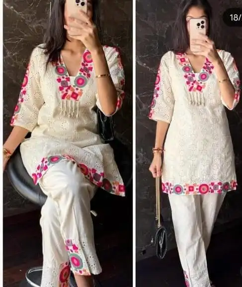 *BEAUTIFUL COTTON SHIFFLEY TOP WITH COTTON PANT. FRONT EMBROIDERY WORK ON TOP AND BOTTOM . WORK : - EMBROIDERY AND KODI ATTACHED FRONT NECK EMBROIDERY SIZE :- M to xxl FABRIC :- cotton shiffley PANT :-cotton Attached cotton inner Free shipping.